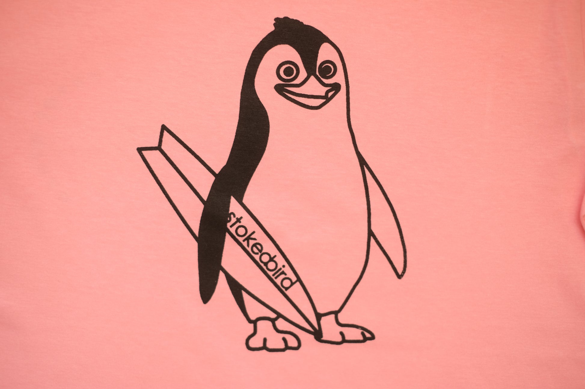 Auf der linken Brust befindet sich das gewebte stokedbird Logo in Kombination mit dem Slogan "Friends are never alone" und einem kleinen gedruckten stokedbird. Der Rücken-Print zeigt unseren Pinguin "Snoozely". Vorne, am linken, unteren Saum befindet sich ein stokedbird Webetikett.