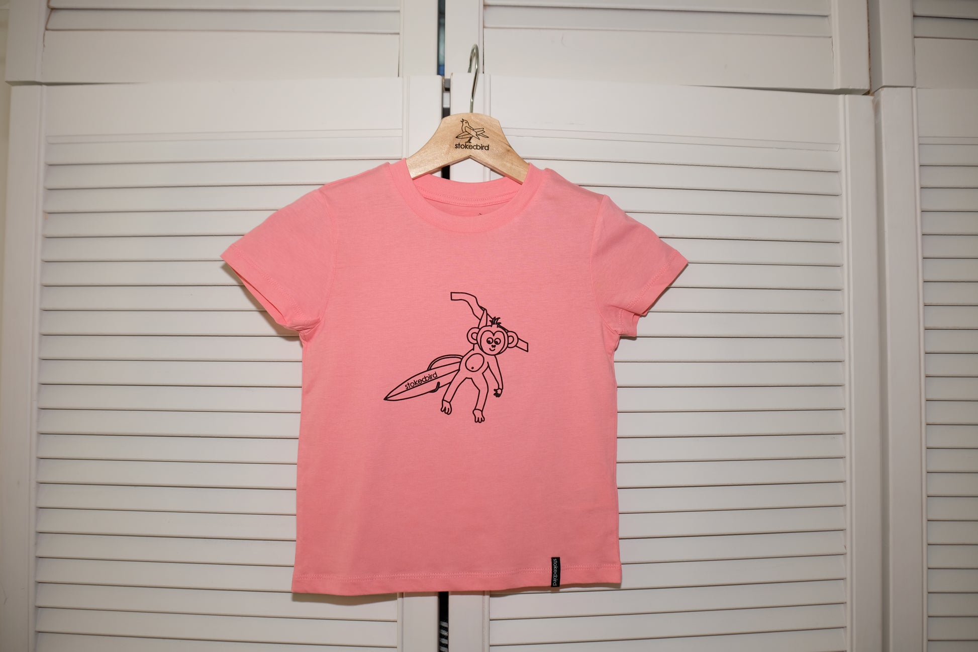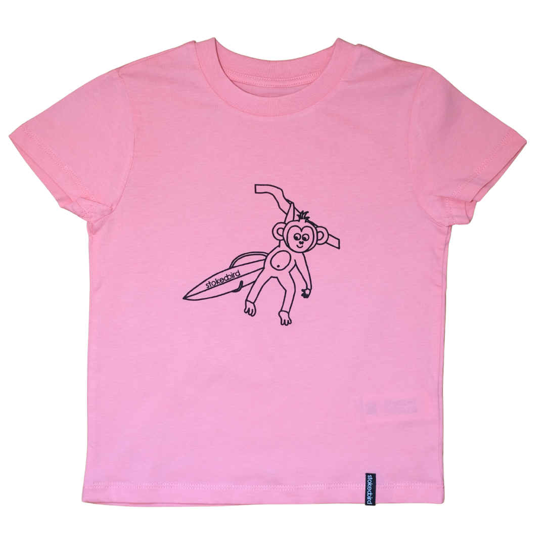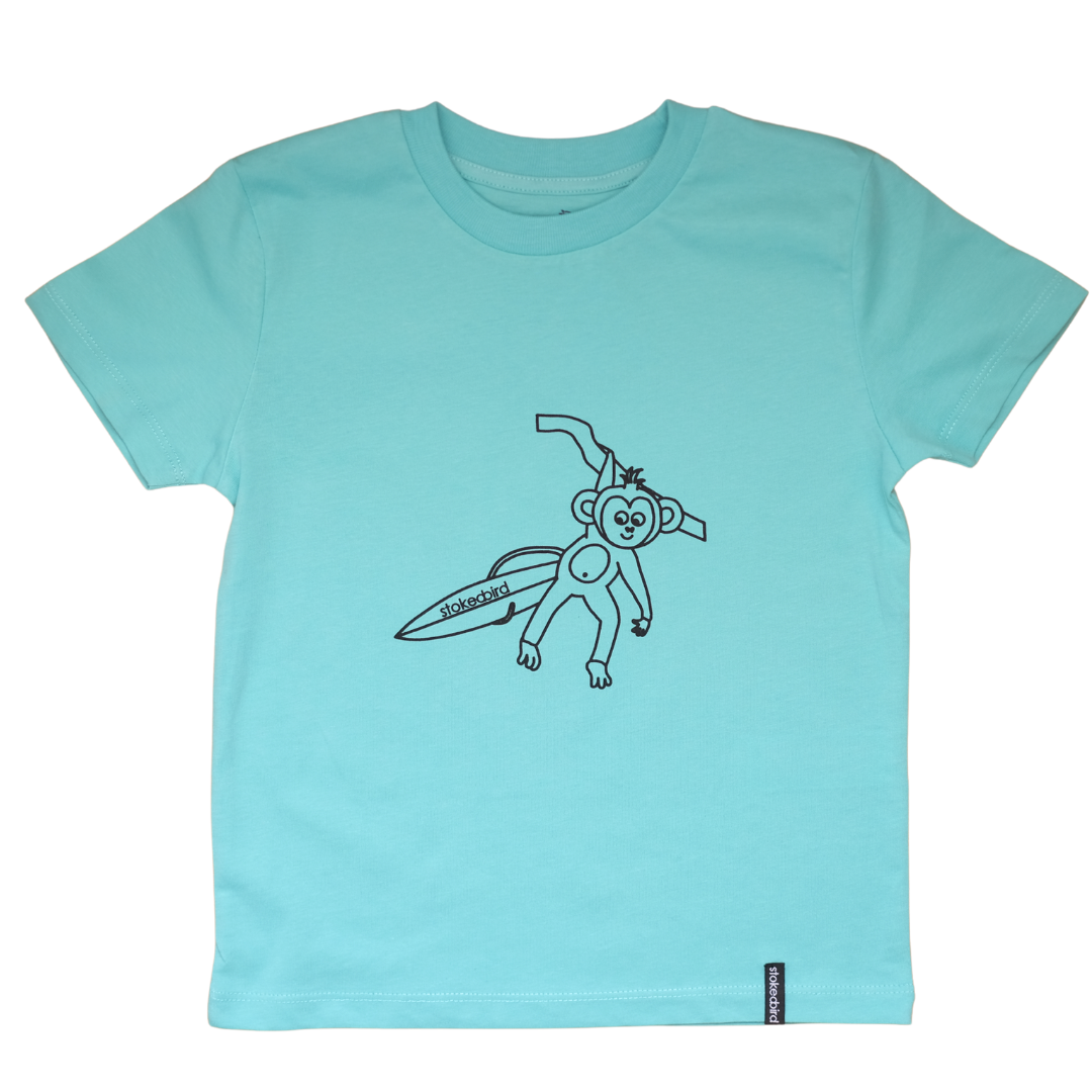 Hier ist unser Affe "Jockel" vorne aufgedruckt. Auf der T-Shirt Rückseite befindet sich unten rechts der Slogan "Friends are never alone" in Kombination mit unserem stokedbird Vögelchen. Vorne, am linken, unteren Saum befindet sich ein stokedbird Webetikett.