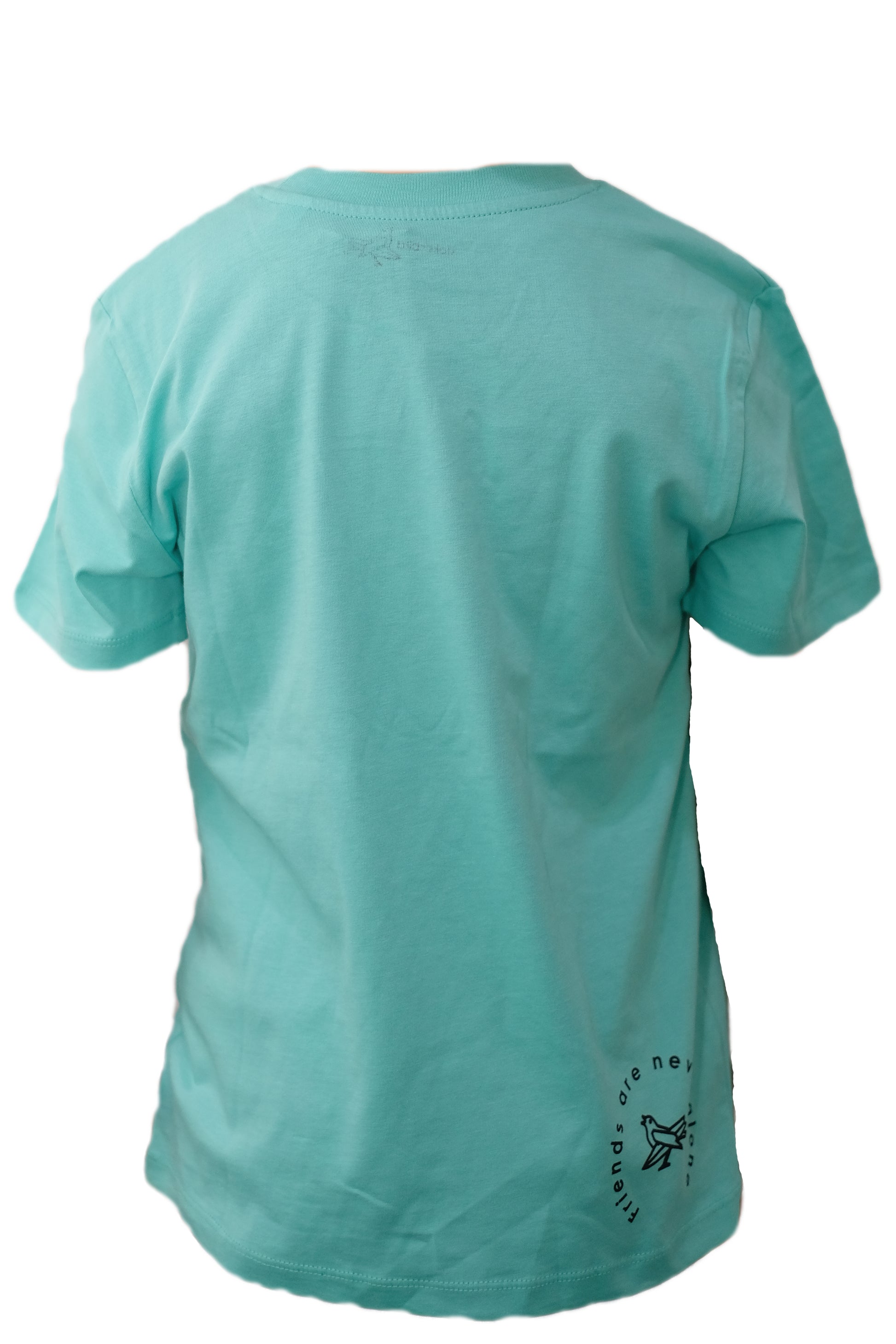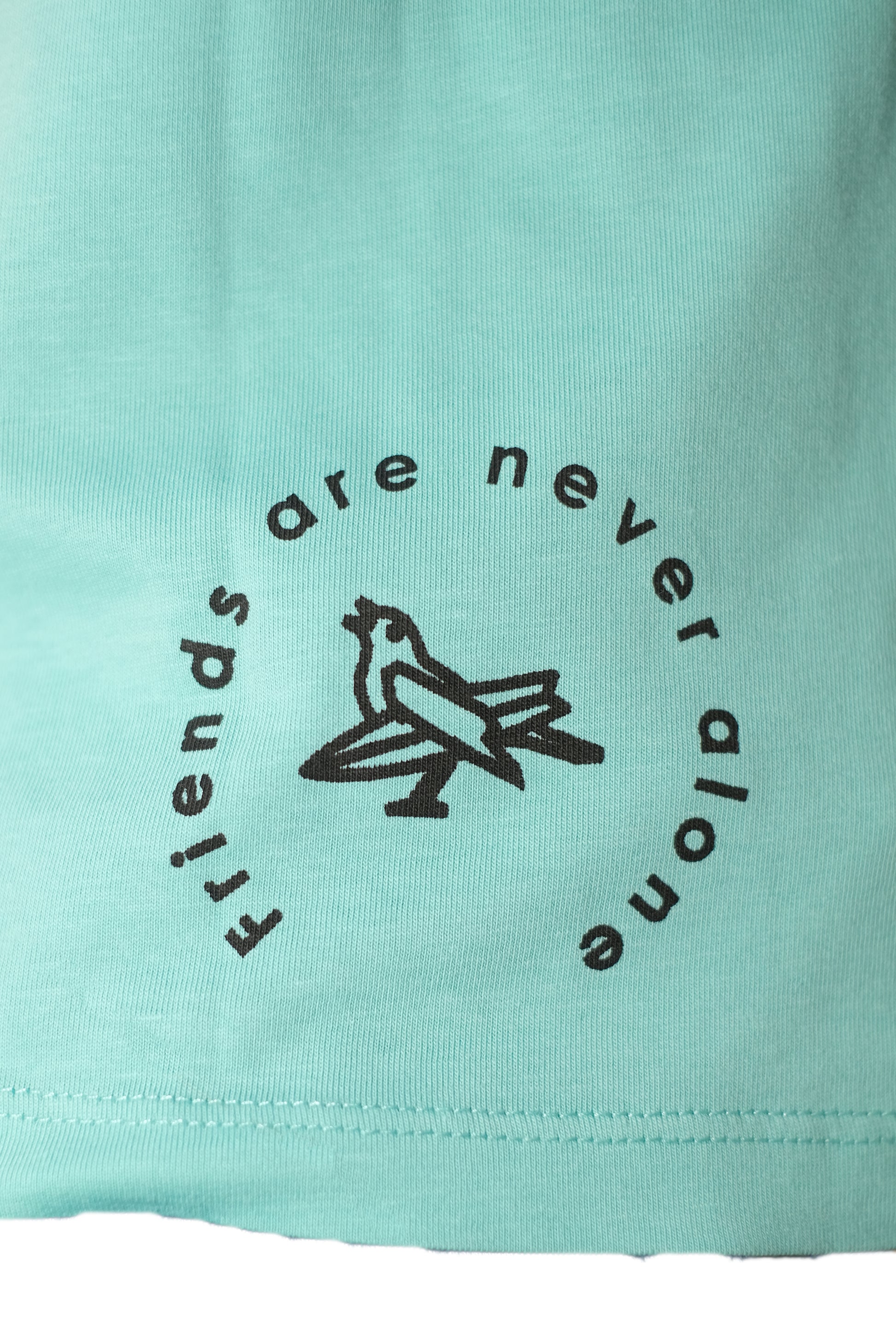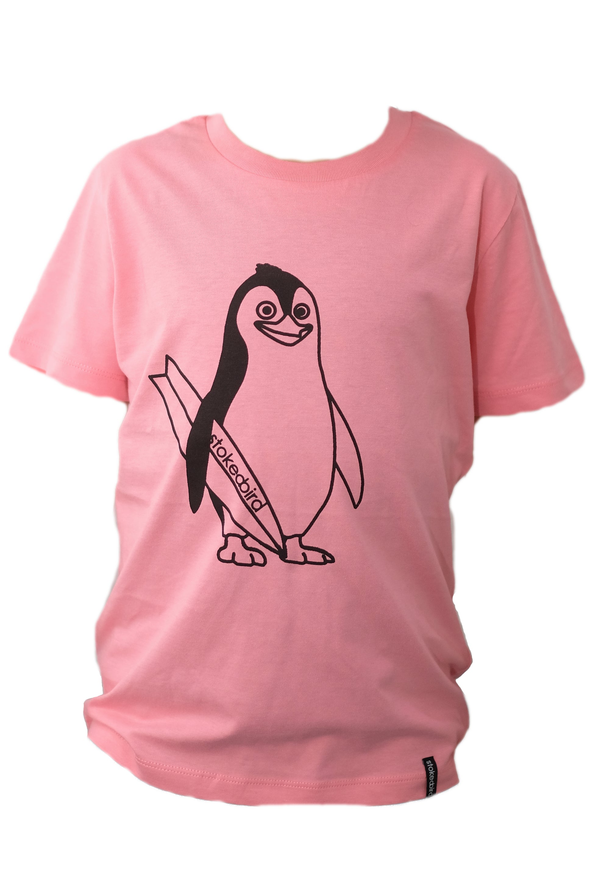 Hier ist unser Pinguin "Snoozely" vorne aufgedruckt. Auf der T-Shirt Rückseite befindet sich unten rechts der Slogan "Friends are never alone" in Kombination mit unserem stokedbird Vögelchen. Vorne, am linken, unteren Saum befindet sich ein stokedbird Webetikett.